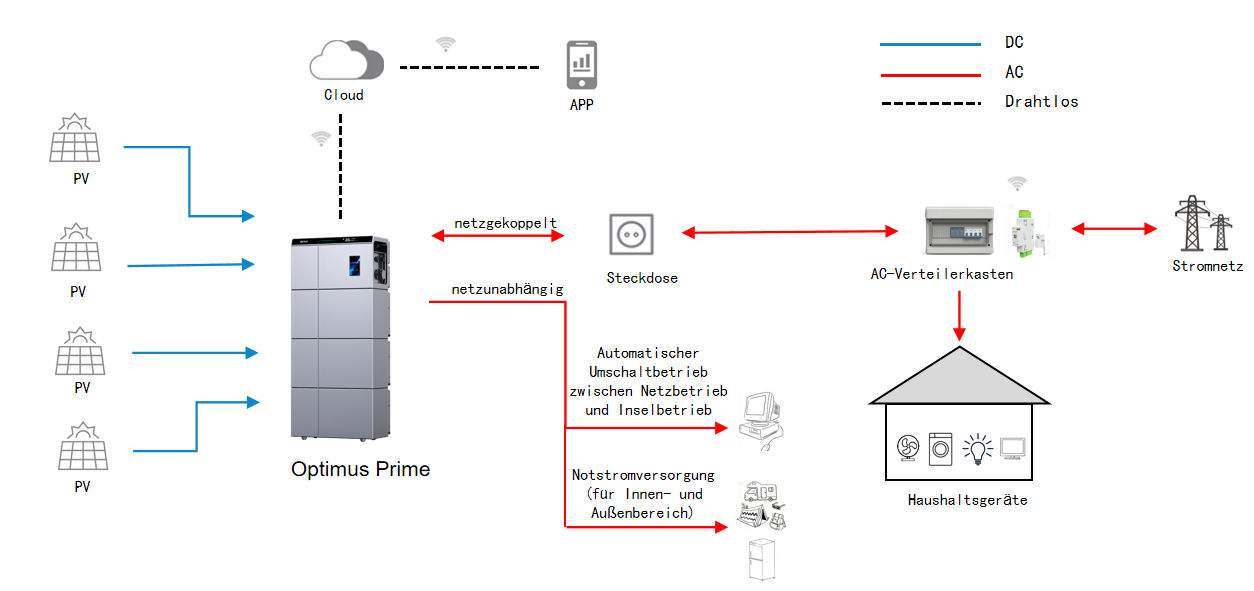 Das System ist eine flexible Heimenergielösung mit integriertem PV-Anschluss, die eine energieautarke Versorgung ermöglicht und den Komfort im Haushalt erhöht. Es unterstützt Netz- und Off-Grid-Betrieb, bidirektionalen Energiefluss sowie die Nutzung als Notstromversorgung.